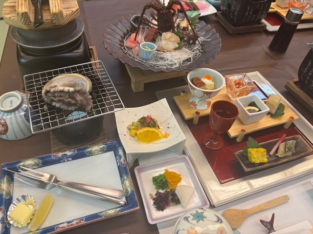 あわびはまだ活きていますが、焼いて食べてしまいます。その他揚げ物や、伊豆名物のキンメダイの煮つけ、和牛陶板焼きなどまだまだお料理が出てまいりました。皆様しっかりと召し上がっていただきました。